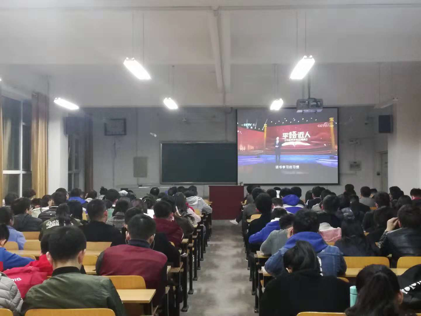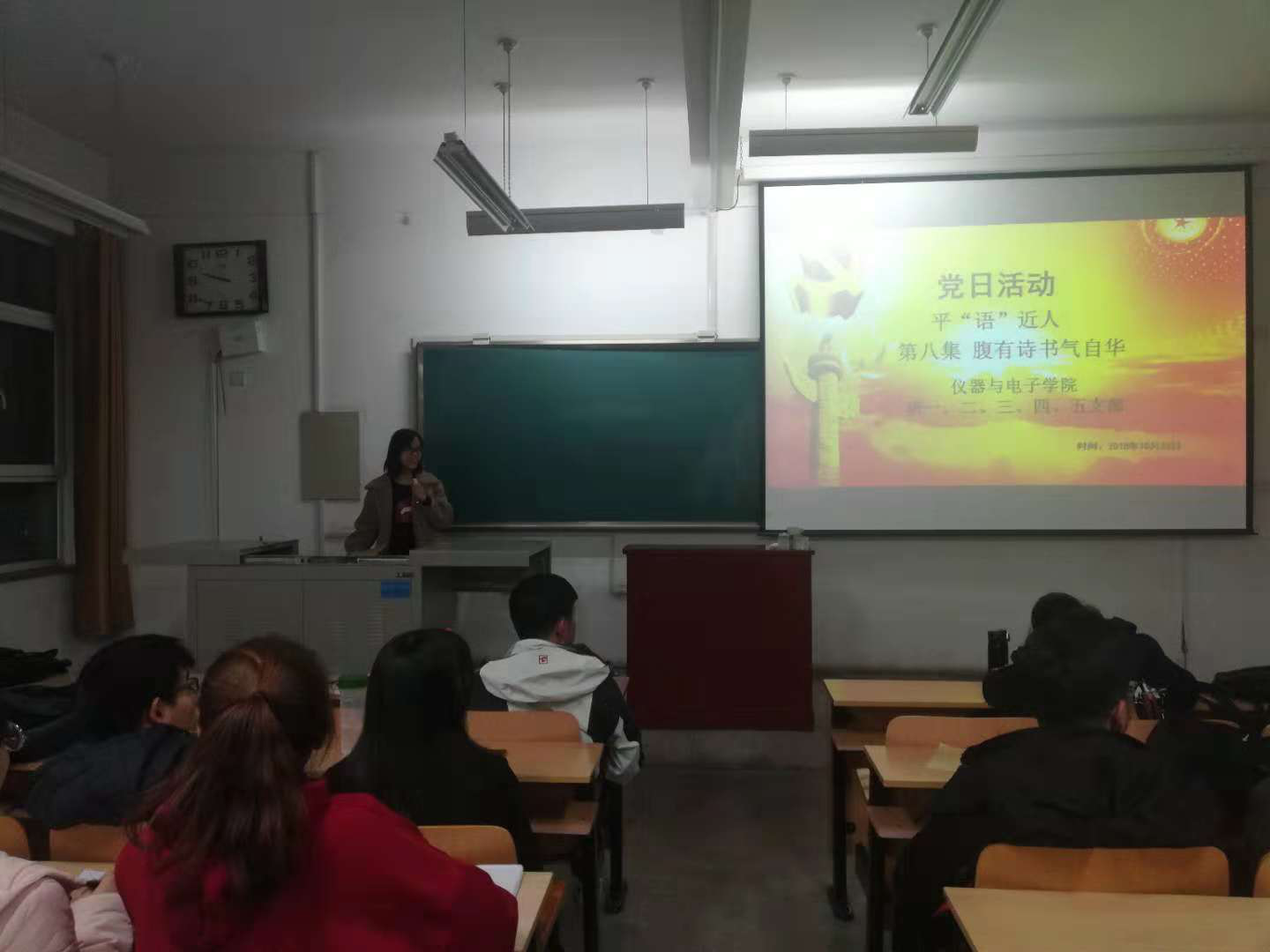为深入学习贯彻习近平新时代中国特色社会主义思想,扎实推进“两学一做”学习教育常态化制度化,不断提升党员素质,增强党性修养,强化责任意识和宗旨意识,不忘民族复兴初心,充分发挥党员学生的先锋模范作用,在研四支部的组织下,研究生全体党支部成员于2018年10月26日在14202教室观看由中共中央宣传部、中央广播电视总台联合创作的《百家讲坛》特别节目--《平“语”近人——习近平总书记用典》第八集《腹有诗书气自华》。
