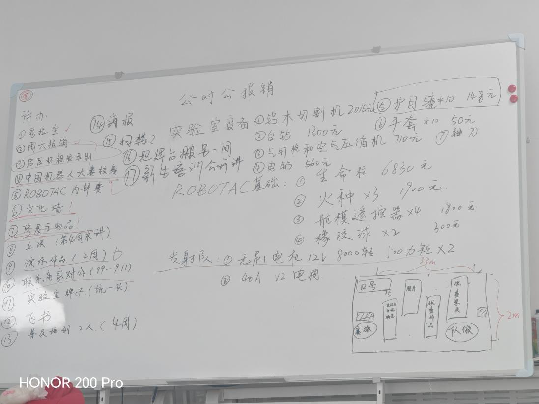 会议内容主要包括Robotac比赛报销事项,以及后续重要工作。在比赛报销方面,主席将需要购买的物品一一列于白板上,并与成员展开讨论,结合实际需求制定了具体的报销方案。在近期重要工作方面,主席将成员进行分组,每组负责不同的工作,保证每一个任务能够有序推进,并重点强调近期的实验室宣传工作,商讨实验室海报的设计方案。