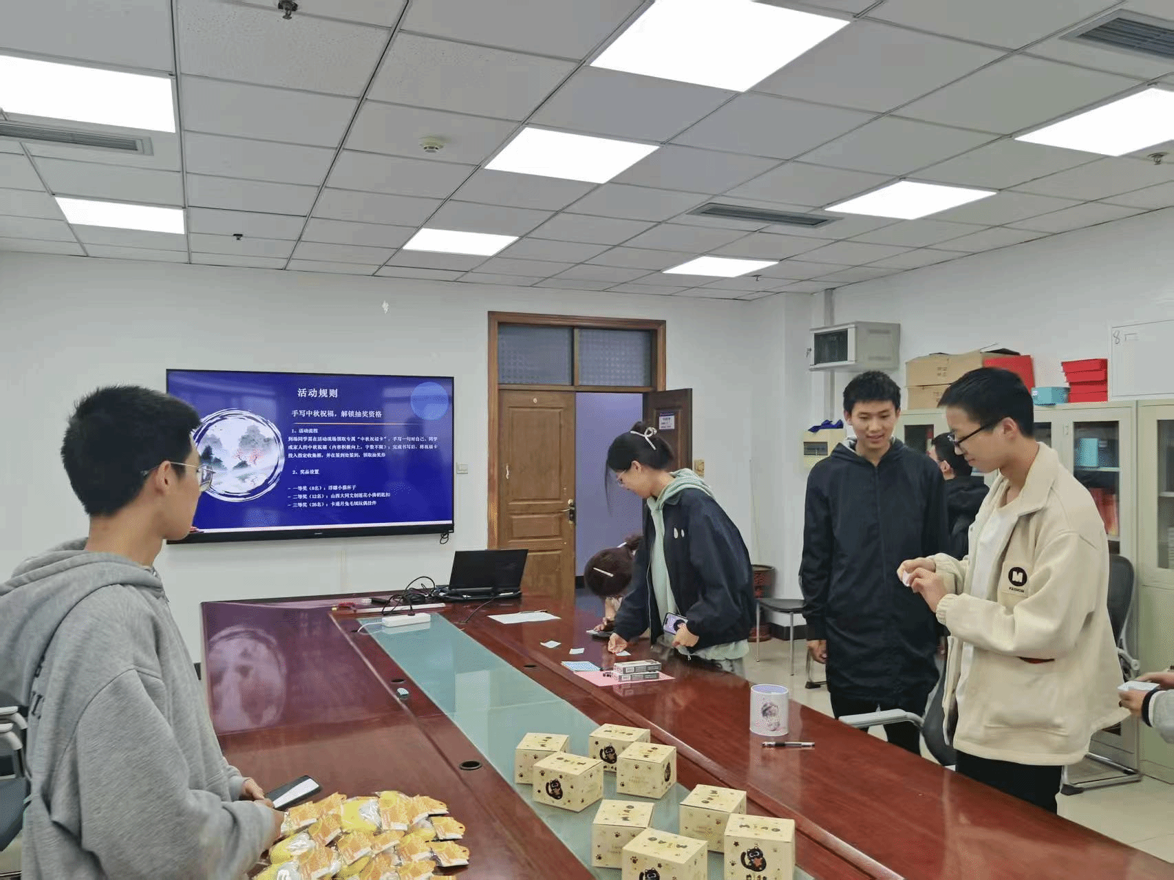 活动现场,老师与志愿者们提前布置好温馨展台,桌上整齐摆放着中秋礼物和手写祝福卡。到场同学先领取专属“中秋祝福卡”,伏案写下对自己的期许、对同学的鼓励或对家人的思念,随后将满载心意的卡片投入收集箱,即可领取抽奖券,参与后续的惊喜抽奖环节。