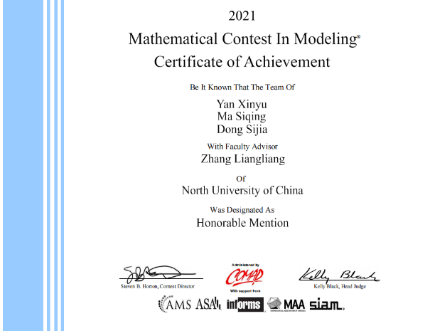 机缘巧合下了解到数学建模,发现这是一个利用数学思想来解决生活问题的比赛,经过大二学年的准备,在大三学年开学后经过三天的时间完成了我们的论文,最终取得了不错的成绩。在其中我悟到了两点,一是坚持,二是合作。在完成一件事的道路上一定会有n次想放弃,建模时三天三夜睡眠匮乏,灵感缺失的情况下很容易想要放弃,但一定要坚持,相信努力会有收获。对于团队比赛来说,个人能力强并不能成就什么,优秀的合作才是制胜的关键,团队合作一定要做的就是相互包容,相互理解,积极沟通交流,这样才可以达到1+1>2的效果。