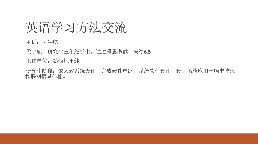 研究生三年级孟宇航同学分享了自己在英语学习过程的学习经验。孟宇航同学在本科阶段通过英语四六级,研究生一年级阶段通过雅思考试,雅思成绩达到了6.5分。