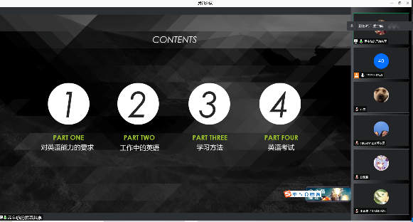 2021年12月29日,通过腾讯会议,组织同学就大学阶段如何学习英语,以及英语学习在今后的工作中的作用进行了交流。