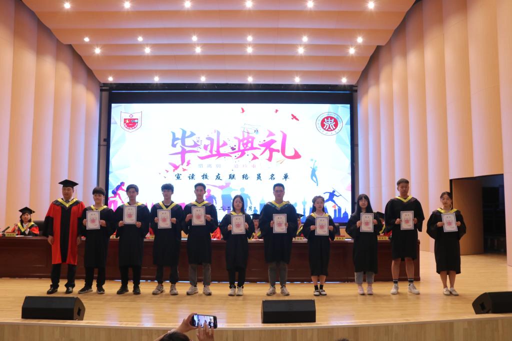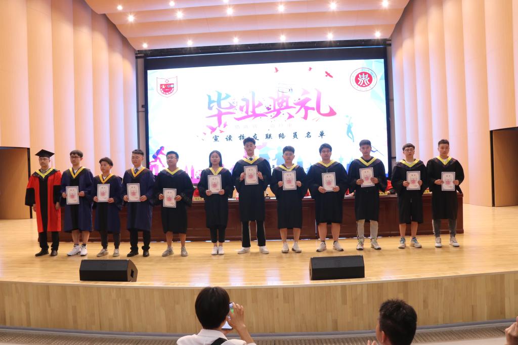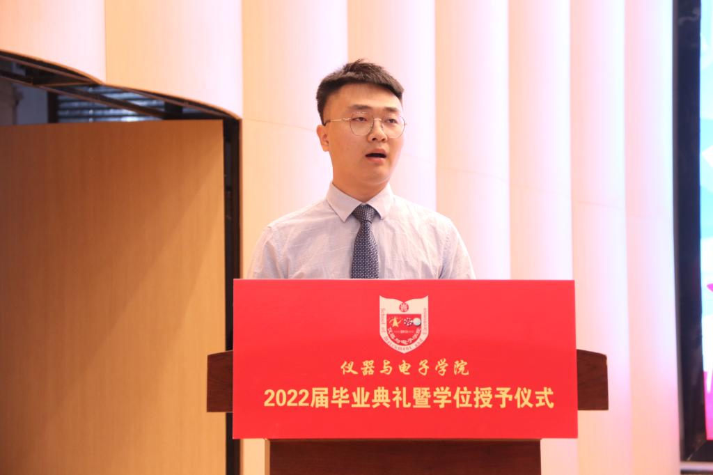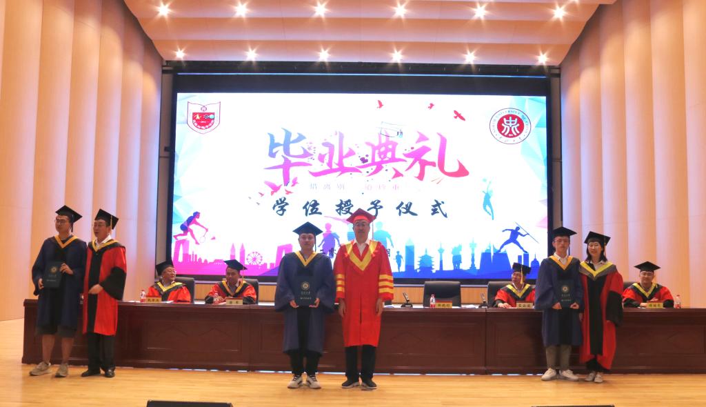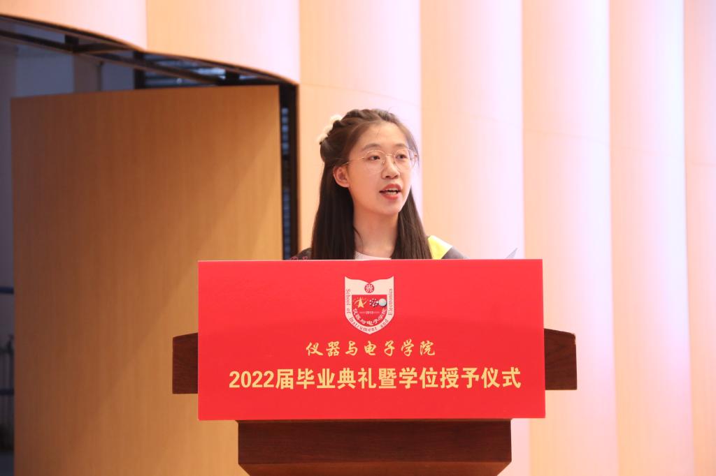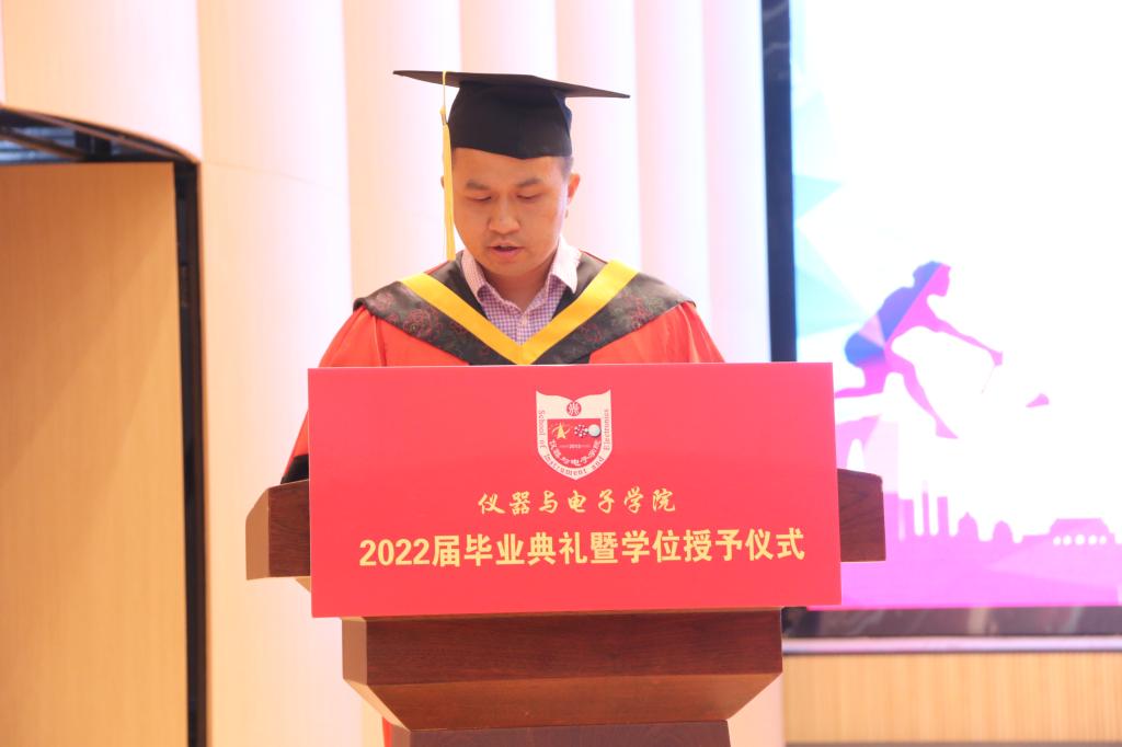 副院长唐军宣读学位获得者名单。毕业研究生代表关一浩和毕业本科生代表安琪分别代表毕业生们向金沙
