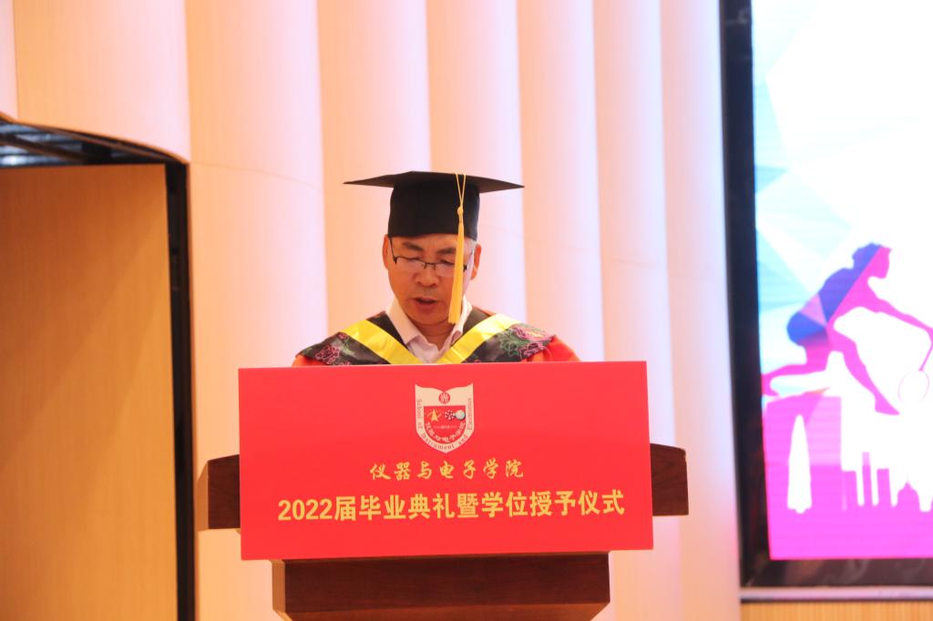 副校长刘俊教授发表毕业致辞,他向顺利完成学业的毕业生们表示祝贺,向即将离开母校,走上工作岗位或继续深造的毕业生同学们送去美好祝愿,同时提出三点希望,希望同学们有奉献精神,树立责任担当;沿袭“精益求精”的工匠精神,时刻以追求卓越的目标自我鞭策;勇敢面对困难,活出自信的人生。