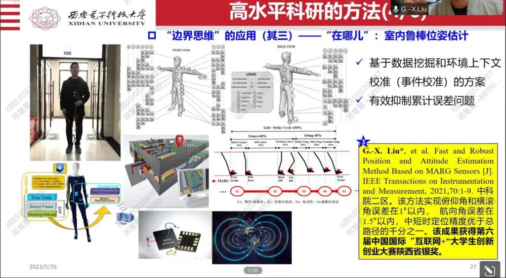 刘公绪副教授围绕高水平科研的思考与准备,讲述了“边界思维”的应用,研究的室内鲁棒位姿估计基于数据挖掘和环境上下文校准的方案,能够有效抑制累计误差问题,该成果获得第六届中国国际“互联网+”大学生创新创业大赛山西省银奖。
