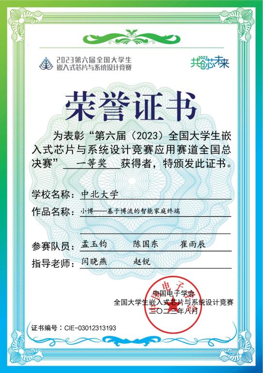 2023年,获第六届全国大学生嵌入式芯片与系统设计全国一等奖