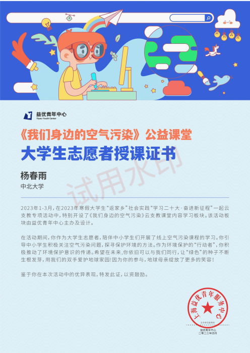 与此同时,我也希望通过分享自己的所学,帮助更多的人。在2023年寒假,我参与了第六届“一起云支教”活动,与孩子们一同在线阅读、互动和运动,帮助他们在学习和生活中找到乐趣。2024年,我参加带给我希望俱乐部志愿活动,帮助太原市福利院小朋友进行课业辅导,用行动践行青年担当,传递爱与知识。通过这些经历,我深刻体会到志愿服务不仅是对社会的回馈,也是对自身成长的磨炼。未来,我将继续保持这种热情,践行新时代青年的责任与担当。