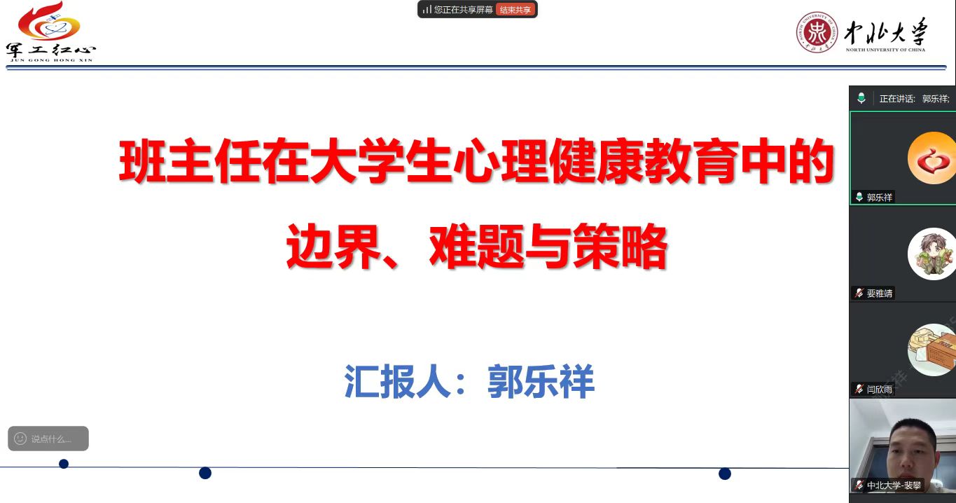 学生手册》的培训中,重点学习了学生请销假、学籍管理、学业预警、纪律处分等学生日常事务管理的相关规定;在资助培训中,重点学习了家庭经济困难学生认定、各类助学金的评定以及常见的误区等相关内容;在评奖评优培训中,重点讲解了各类奖学金的评定准则以及评定流程;在学生干部的选拔与培养中,重点交流了通过科学选拔并注重德才与服务意识,系统性地培养、管理与激励学生干部,使其发挥带头作用,从而筑牢班级建设根基,助力学生成长;在班团建设培训中,重点就团员关系转接、三会两制一课、团日活动、团员教育评议、团员发展、评优、社会实践、新生活动等工作与新生班主任沟通交流;在心理健康教育培训中,与班主任交流了心理危机干预的识别与预防的内容。