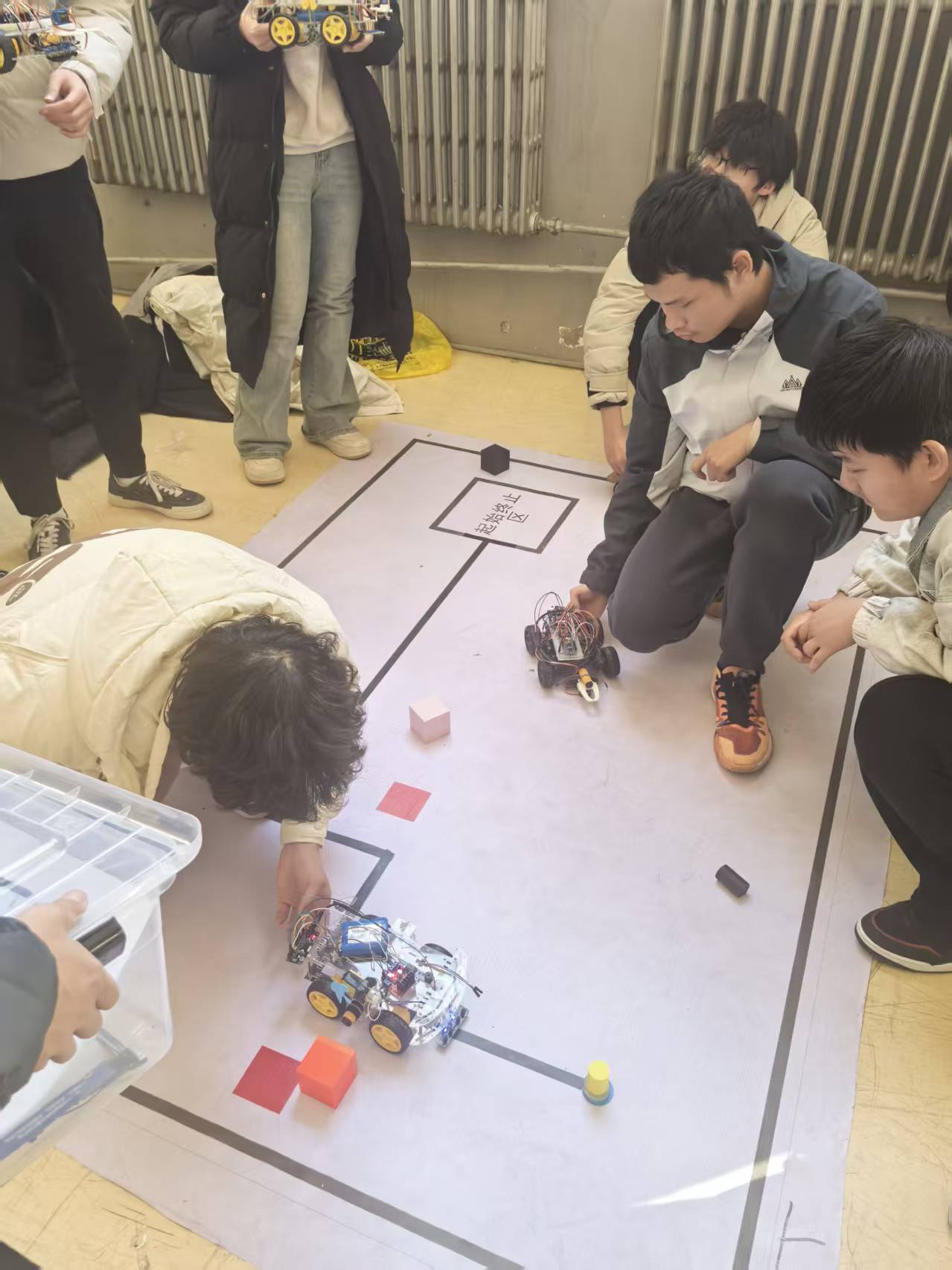 赛场上,各参赛选手的作品纷纷亮相,小车在指定赛道上灵活穿梭。随着裁判一声令下,小车精准识别路线,平稳穿越模拟火灾区域,部分作品搭载的风扇准时开启、蜂鸣器同步鸣笛,完美完成灭火警示动作;在物资抢救环节,小车夹爪精准抓取圆柱物资,稳稳承载其原路返回,不少选手的作品成功将物资完全放置于起始终止区,赢得现场阵阵掌声。调试阶段,选手们在创新精英研究院实验室反复调试,细心排查问题;比赛过程中,工作人员严格把控公平公正,赛后统一将参赛车辆标记以防作弊,确保赛事有序开展。