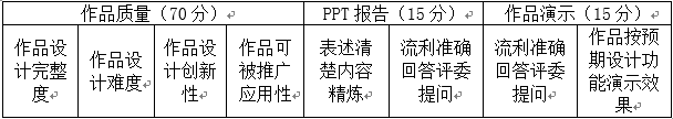 1)评审总分100分,其中作品质量评审70分,设计报告陈述15分,实物作品演示15分;