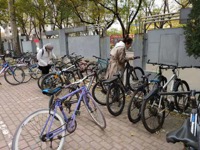 图书馆前开展了以“有序停车、美化校园”为主题的整理乱停乱放自行车的志愿者活动。