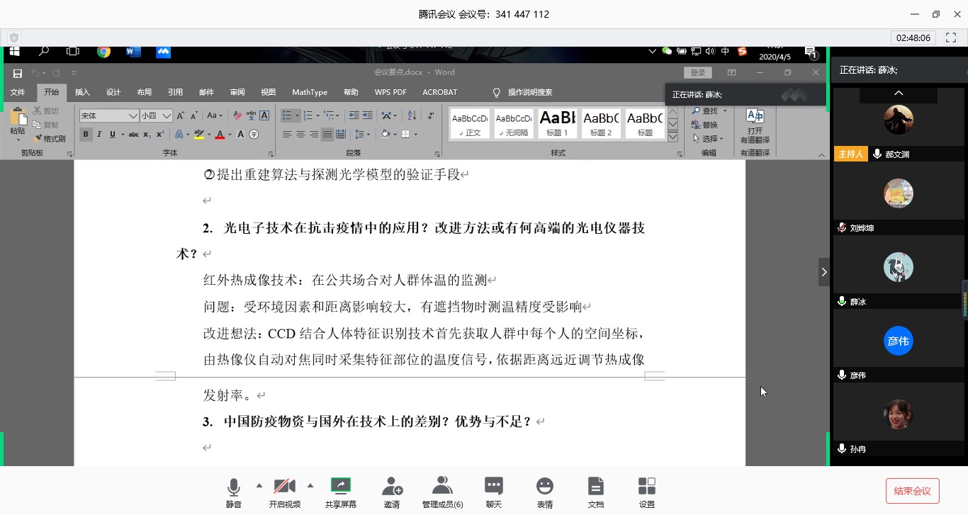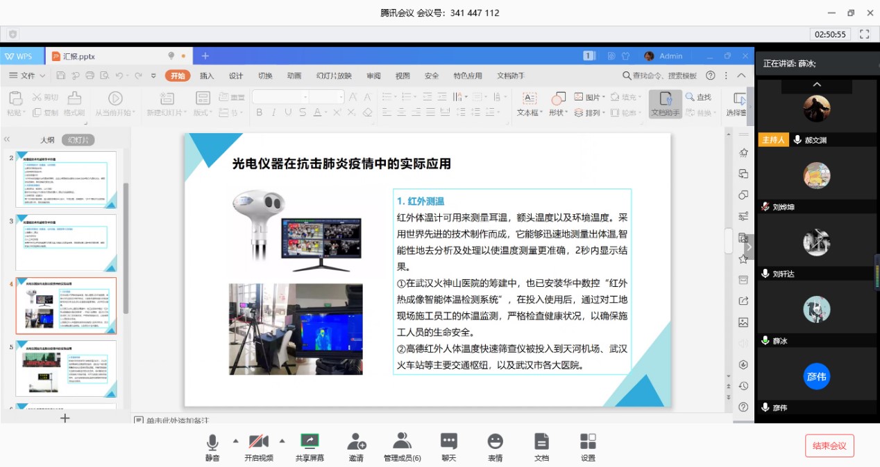 光电技术离不开现实的应用,故而研究生培养要与时代课堂紧环相扣。针对光科学与工程中心(OSEC)团队国家自然科学基金、军装发领域基金、省基金、重点实验室基金所涉及到的和新冠疫情相关的科学问题、关键技术通过本次腾讯会议进行云端交流。